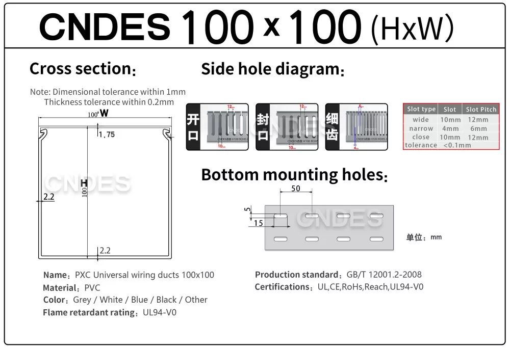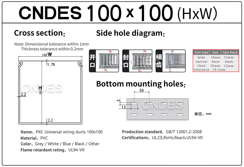เพิ่มประสิทธิภาพโครงการเดินสายเคเบิลของคุณด้วยท่อสายเคเบิลจัดการสายไฟขนาด 100×100 แบบกำหนดเองของเรา ในฐานะผู้ผลิตและซัพพลายเออร์ถาดสายเคเบิล PVC ชั้นนำในประเทศจีน CNDES มอบโซลูชันที่เชื่อถือได้ มีความแม่นยำสูง และปรับแต่งได้สำหรับทุกความต้องการในการจัดการสายเคเบิลของคุณ เรามีข้อกำหนดทั้งหมดของท่อสายไฟ (ถาดสายเคเบิล) หากคุณต้องการข้อกำหนดอื่น ๆ โปรดติดต่อเรา!