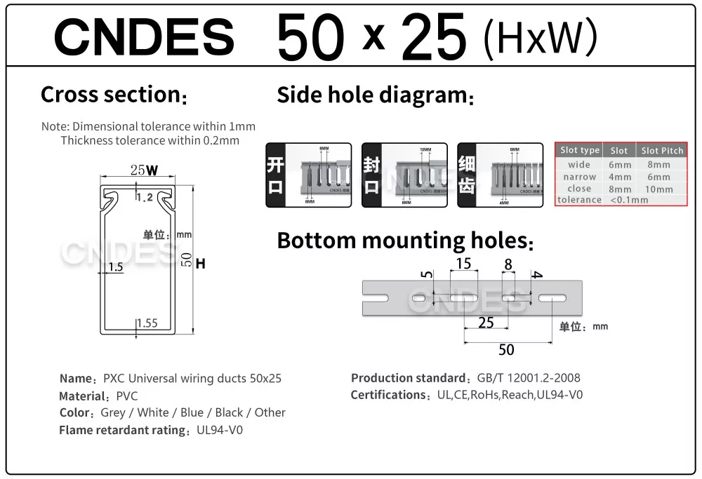ผลิตจากวัตถุดิบ PVC คุณภาพสูง เป็นมิตรกับสิ่งแวดล้อม ไม่ลามไฟ และมีคุณสมบัติทางกายภาพที่มีความแข็งแรงสูง คุณสามารถมั่นใจได้ในการซื้อท่อตู้ไฟฟ้า PVC Slotted PVC ของ CNDES จากโรงงานของเรา